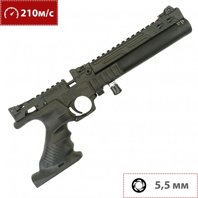Пневматический пистолет Jet 1 производства турецкой компании Hatsan - модель с боковым (с левой стороны) типом заряжания, с предварительной накачкой (РСР), в основном предназначенная для спортивной стрельбы. Ствол пистолета нарезной, в качестве боеприпасов используются свинцовые пули калибра 5,5 мм, магазин барабанного типа вмещает 7 пуль.